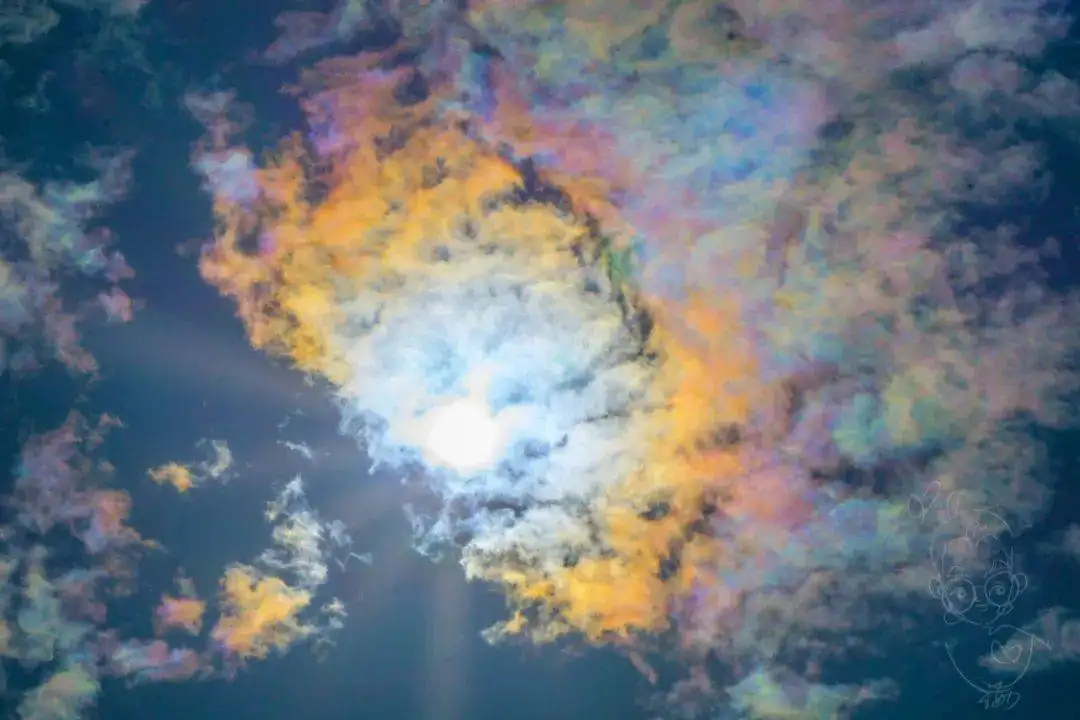 幞状云内因为高度足够高,在冻结层以上,这里的水汽以过冷水或者小冰晶的形式存在,在合适的太阳角度之下,就会形成虹彩。